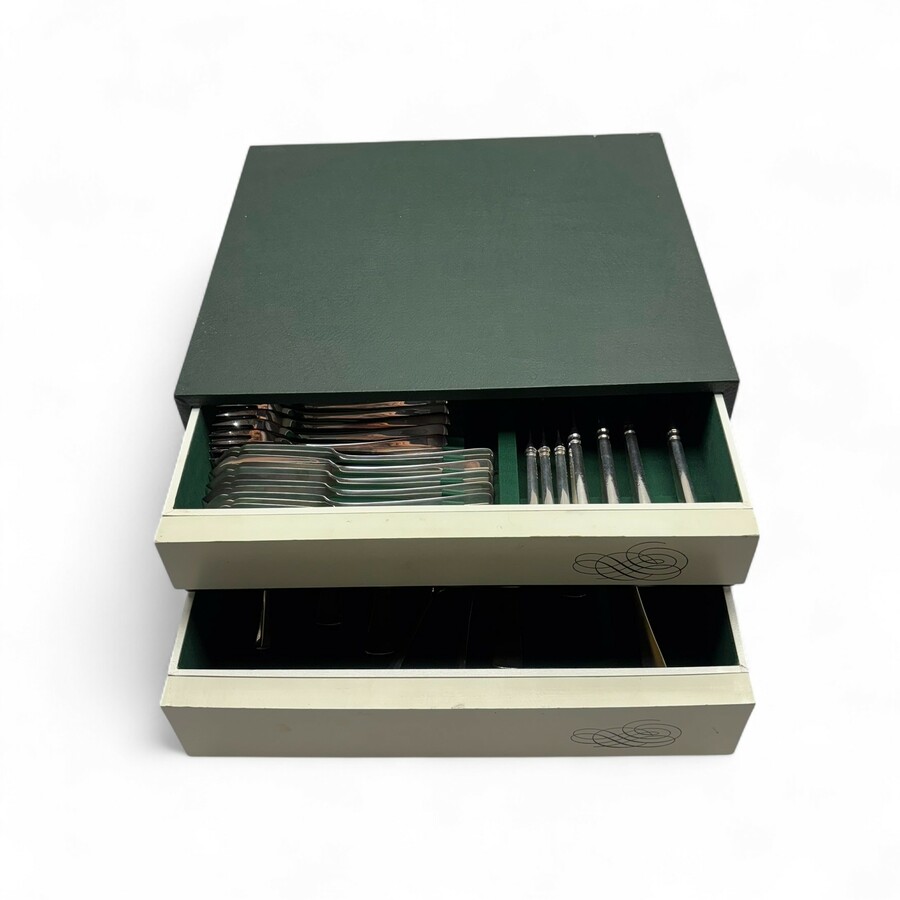Een 20e eeuwse bestekcassette met puur zilveren (999/1000) zilveren bestek, model Haags Lof. Bestaande uit zes lepels (18 cm), zes vorken (18,5 cm), zes couverts visbestek (18 en 21 cm), zes kle...