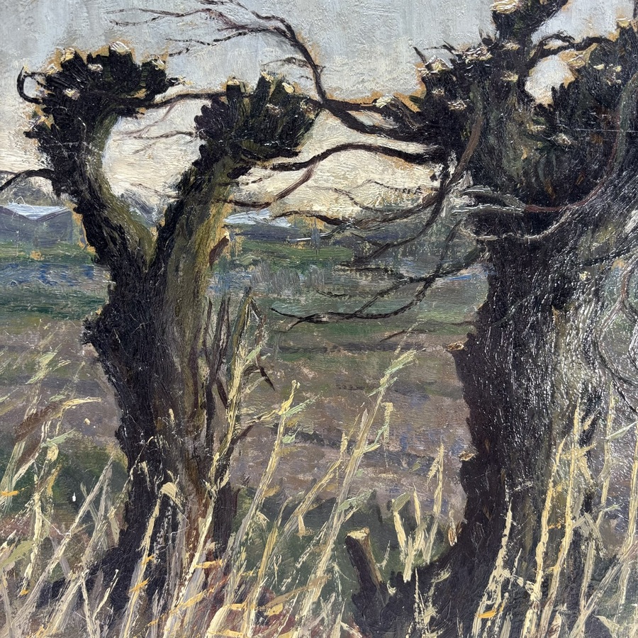 Schilderij, olieverf op paneel. Twee wilgen, rechtsonder gesigneerd (‘atelier’) Jan Stroosma (Leeuwarden 1928 – 1983).