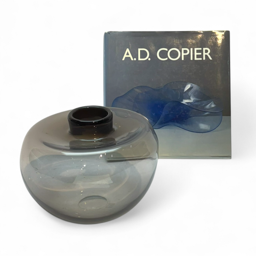Een grijs glazen Leerdam "Unica" bolvaas, 22 cm hoog x 24,5 cm doorsnede. Van licht oplopend naar donker. Jaarletter V voor 1943 en nummer 841. Ontwerp en gesigneerd A.D. Copier (1901-1999), Lee...