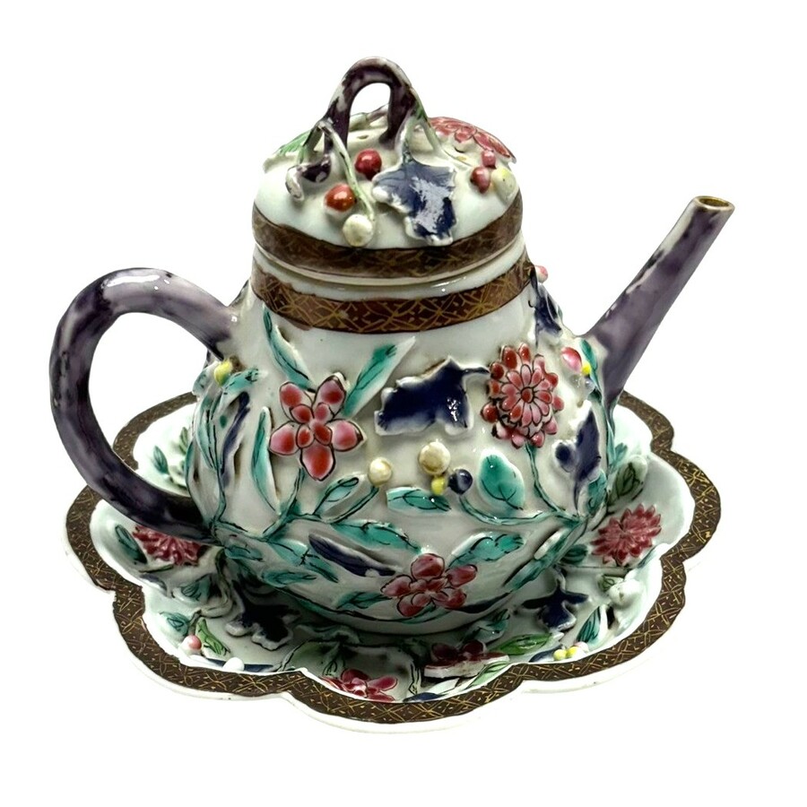 Chinees porseleinen famille rose theepotje met bijbehorende geschulpte onderschotel, het geheel rijkelijk gedecoreerd met verhoogde florale motieven in paars, groen en roze, afgezet met bruin-go...