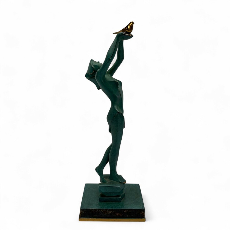 Groen gepatineerd bronzen beeld met vergulde details: gestileerde jonge vrouw die een vogel vrijlaat, staand op vierkant basement, onduidelijk gesigneerd in basement, modern
