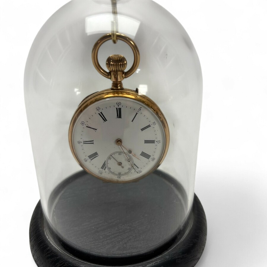 Herenvestzakhorloge in 14 karaats gouden kast, de geëmailleerde wijzerplaat met Romeinse cijferring, de wijzertjes elk ingelegd met een steentje, het deksel gedecoreerd met band van voluten met ...