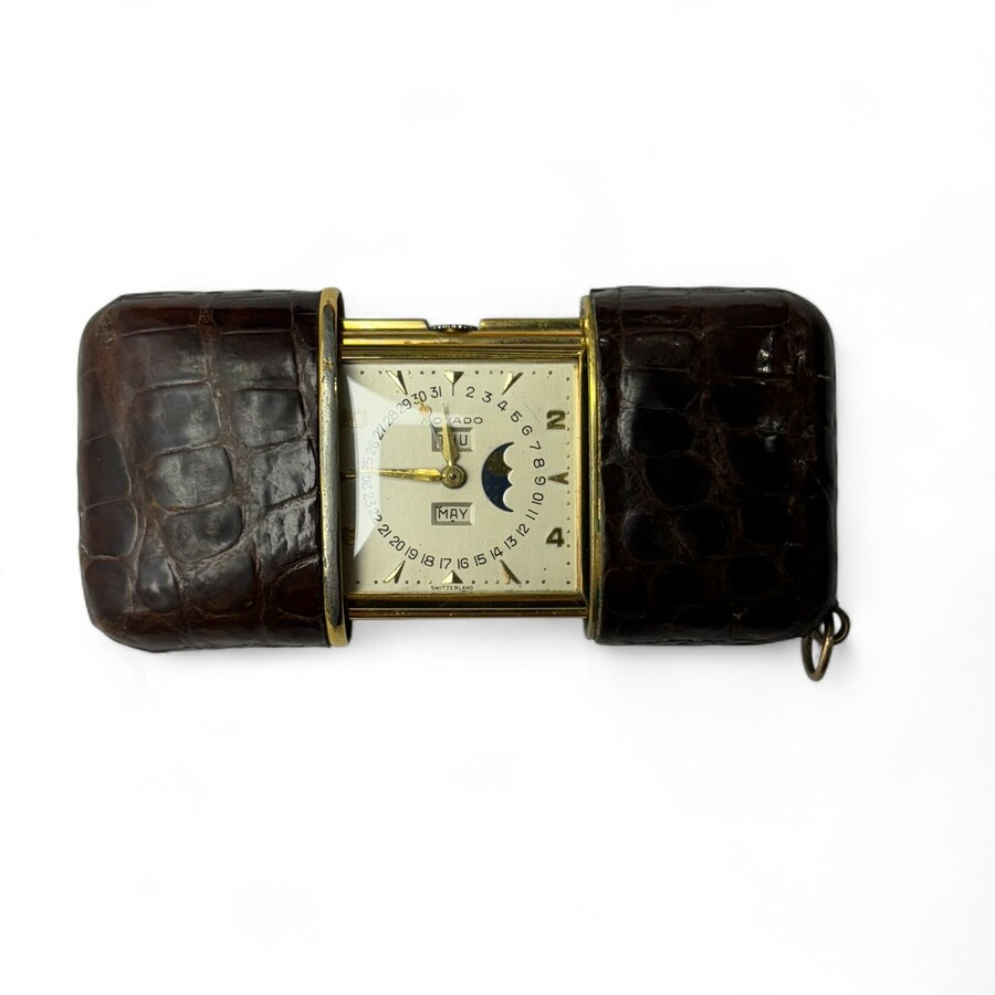 Verguld metalen pocket watch met dag- en maandaanduiding, gemerkt Movado, in krokodillen lederen foedraal, jaren '20/'30