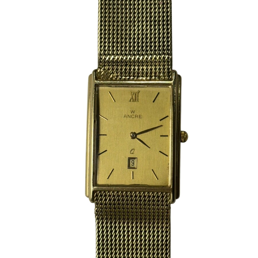 Een 20e eeuws 14 karaats (585/1000) geelgouden herenhorloge, quartz. Vierkante kast, vergulde wijzerplaat met dagaanduiding, gemerkt ‘Ancre’. Op gevlochten 14 karaats (585/1000) band.
