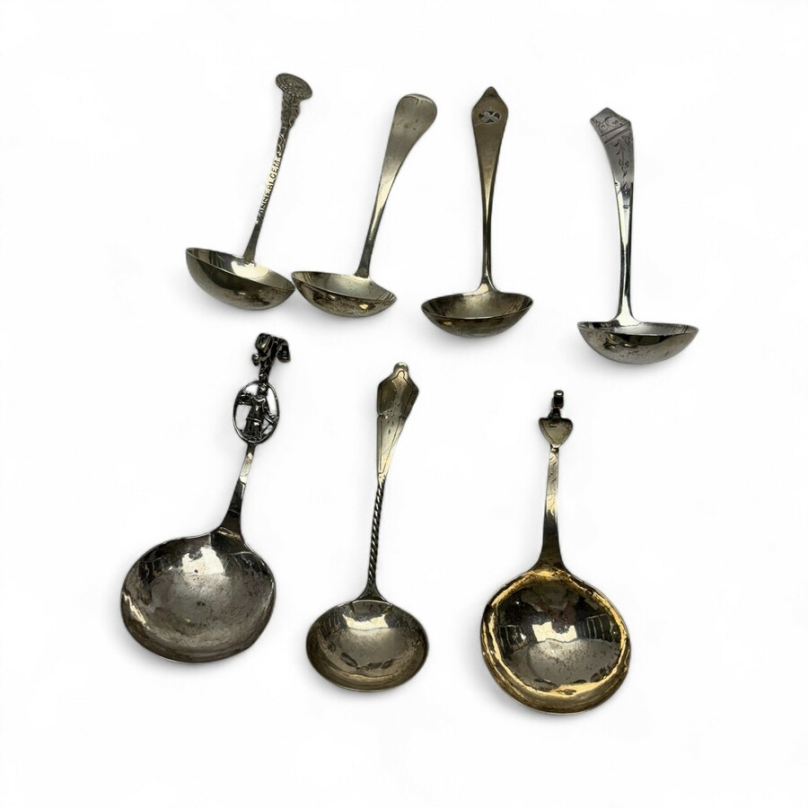 Lot van zeven diverse tweede gehalte zilveren roomlepels.