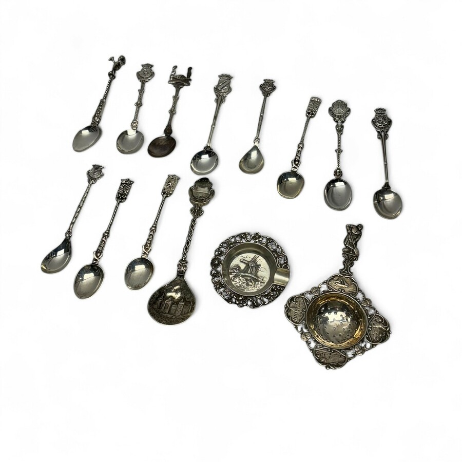Lot zilver: theelepels, suikerschep, asbakje en theezeefje.