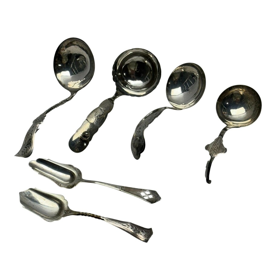 Vier zilveren roomlepels en twee suikerschepjes