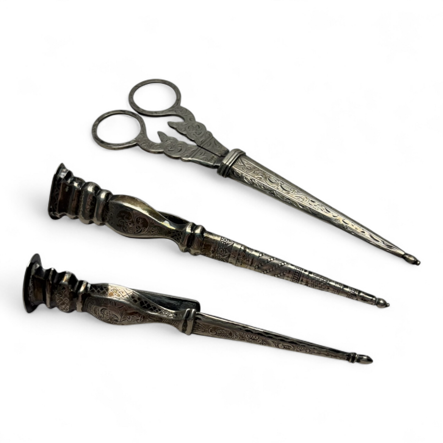 Twee zilveren breipenhouders en naaischaar in schede, o.a. Schijfsma Sneek