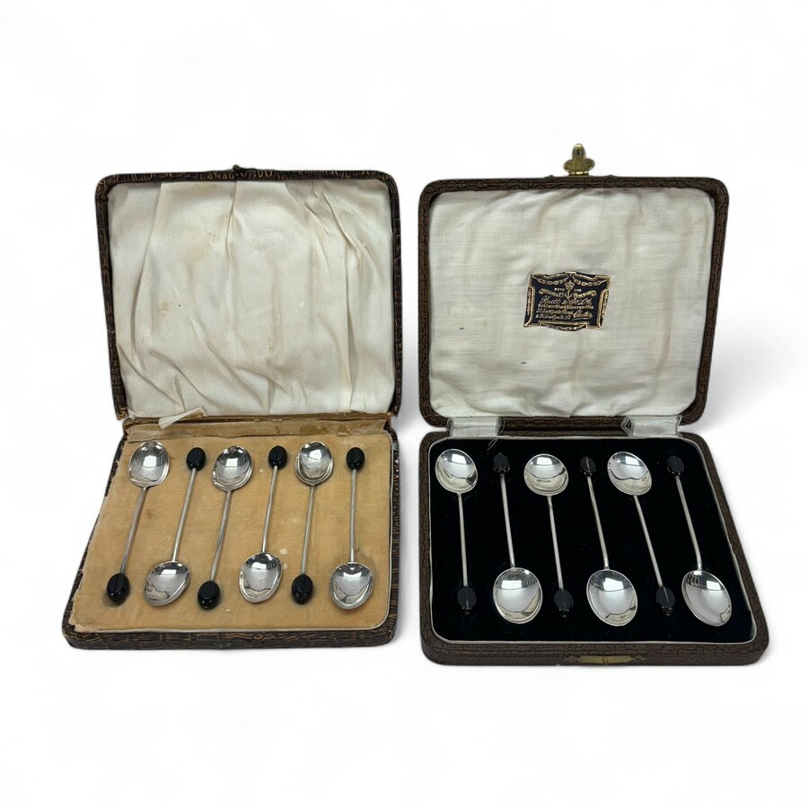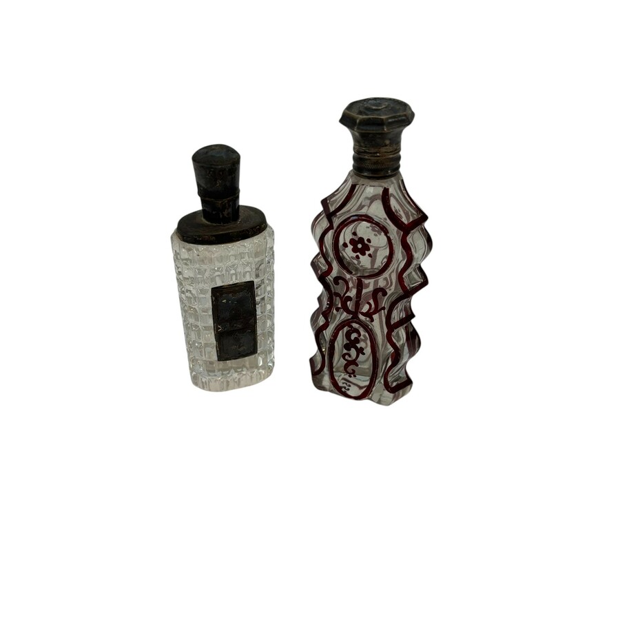 Twee kristallen parfumflacons, waaronder boheems met zilveren doppen en één met zilveren applicatie