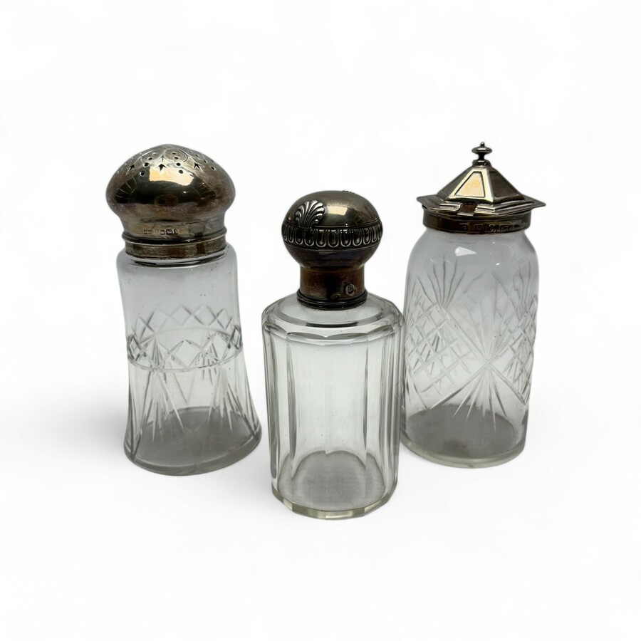 Twee strooibussen en één parfumflacon, met zilveren monturen
