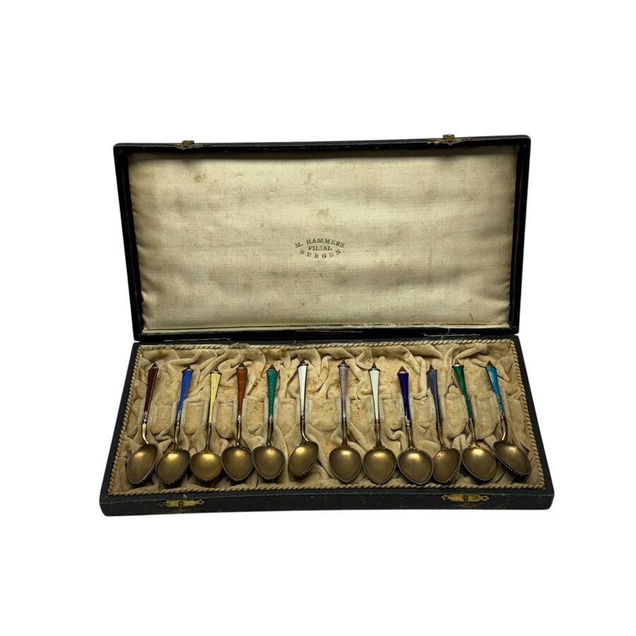 Cassette met twaalf Noorse geëmailleerde zilveren theelepels, Marius Hammer (1847-1927) Bergen