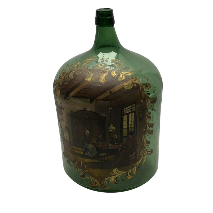 Groen glazen voorraadfles met beschildering