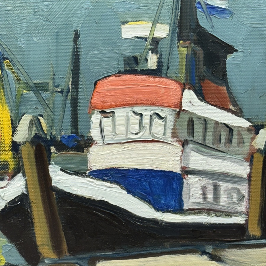 Schilderij, olieverf op doek. Havengezicht, vermoedelijk Harlingen. Verso gesigneerd Wim van der Veer (Leeuwarden, 1939). In zwarthouten baklijst.