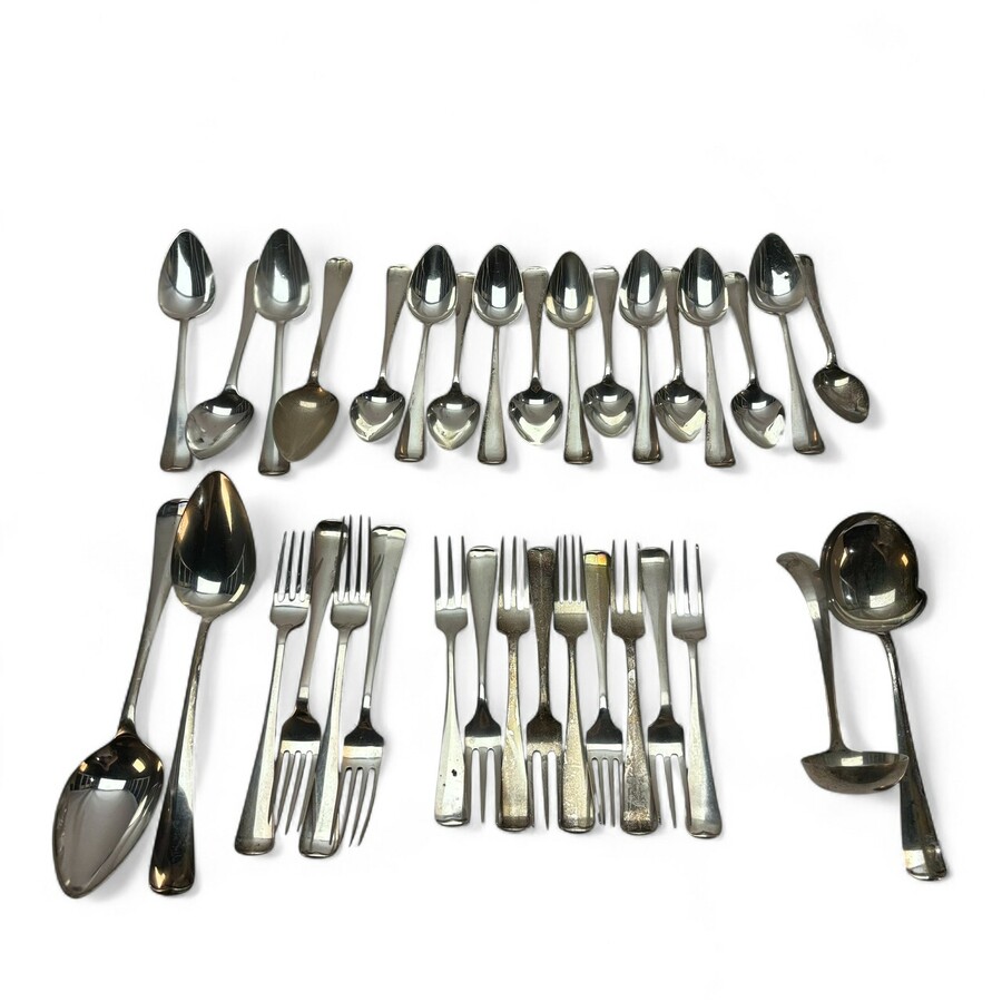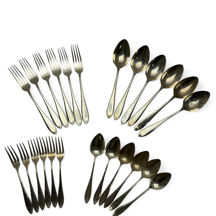 Lot tweede gehalte (835/1000) Nederlands zilveren bestek, puntfilet. Bestaande uit zes kleine lepels (17,5 cm), zes grote lepels (21 cm), zes kleine vorken (17,5 cm) en zes grote vorken (21 cm)....