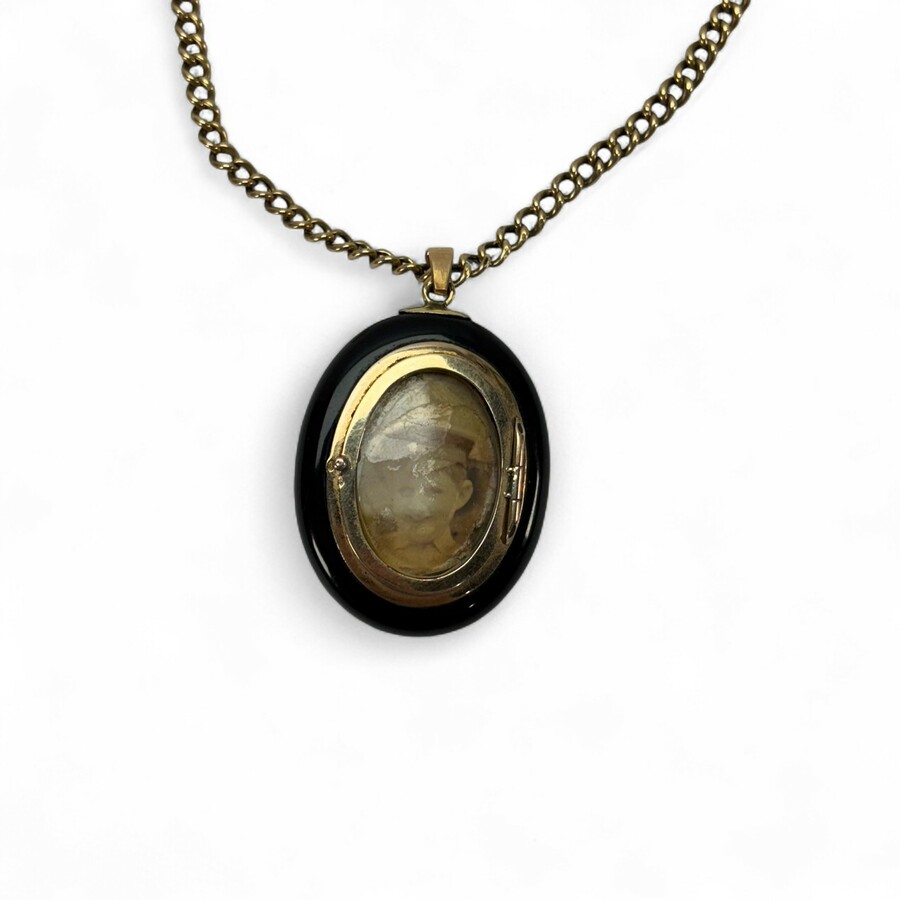 Ovaal onyx rouwmedaillon met 14 karaats gouden portretlijstje, aan de achterzijde met bloemvormige applique ingelegd met zaadpareltjes, 19e eeuw, aan gouden ketting -niet gemerkt- met onedel slu...