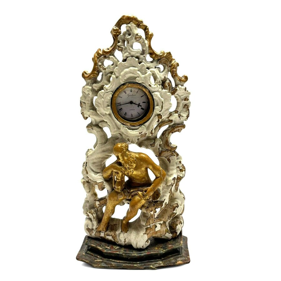 Een antieke 18e eeuwse uit zachthout gestoken en gepolychromeerde zakhorlogehouder, voorstelling van Vadertje Tijd. Vermoedelijk Duits, Louis XV, ca. 1750. Met 18e eeuws zilveren zakhorloge, gem...