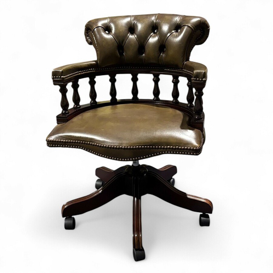 Een 20e eeuwse Chesterfield stijl bureaustoel, met groen lederen gecaptioneerde bekleding en rugleuning met spijlen. Draaibaar en in hoogte verstelbaar, op vijf wieltjes.