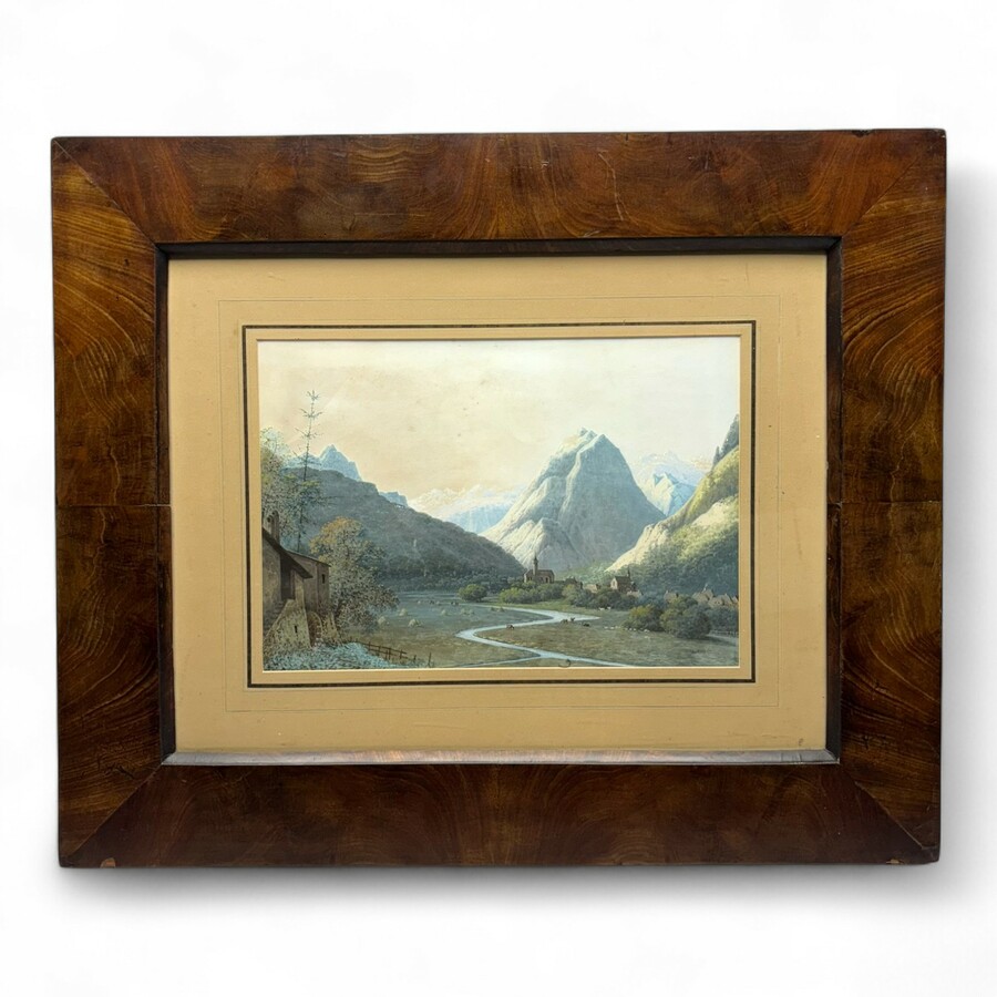 Josephus Augustus Knip (1777-1847), landschap met waterrad in de voorgrond en bergen in de verte, gouache op papier, gesigneerd Josephus Augustus Knip (1777-1847)