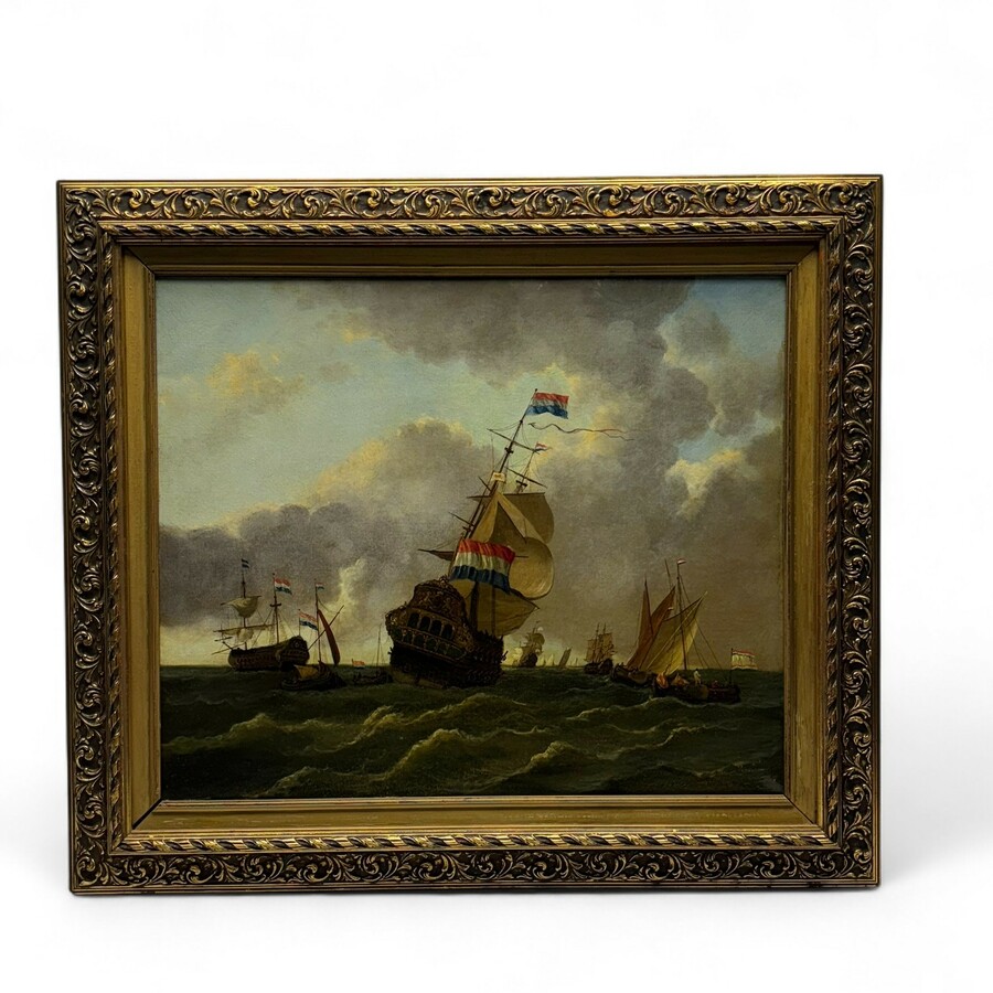 Hollandse School, schilderij, naar 'Terugkomst van De Hollandia in het Landsdiep bij Huisduinen' door Ludolf Backhuysen (1630/1631-1708), olieverf op doek, signatuur vervaagd