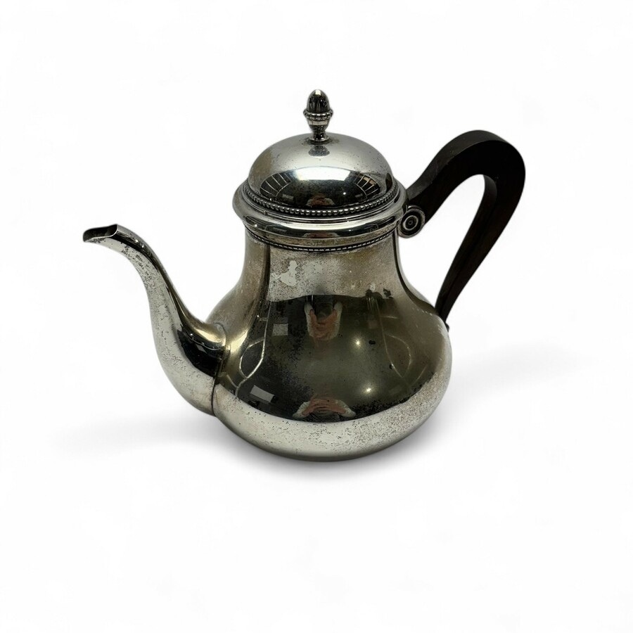 Een tweede gehalte (835/1000) zilveren theeketel aan een palliasander houten handvat. Mr/Importeur D. Aubert, Den Haag.