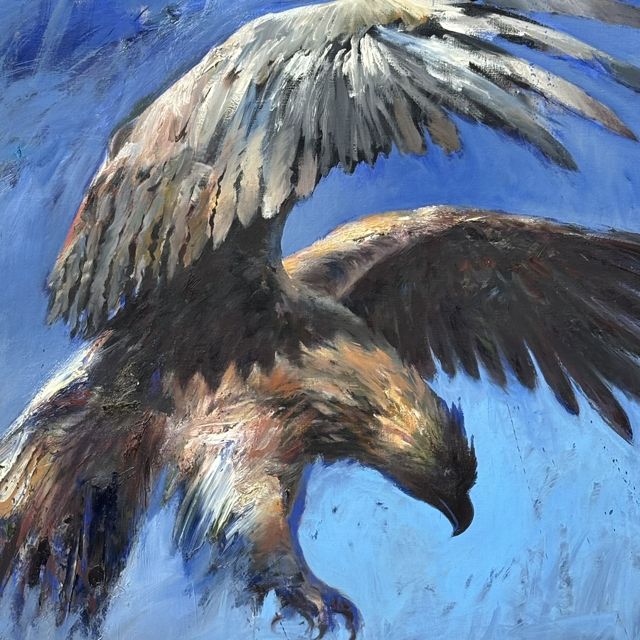Schilderij, olieverf op doek. Voorstelling van een roofvogel, titel ‘Felsö’. Linksonder gesigneerd János Bittenbinder (Roemenië, 1946).