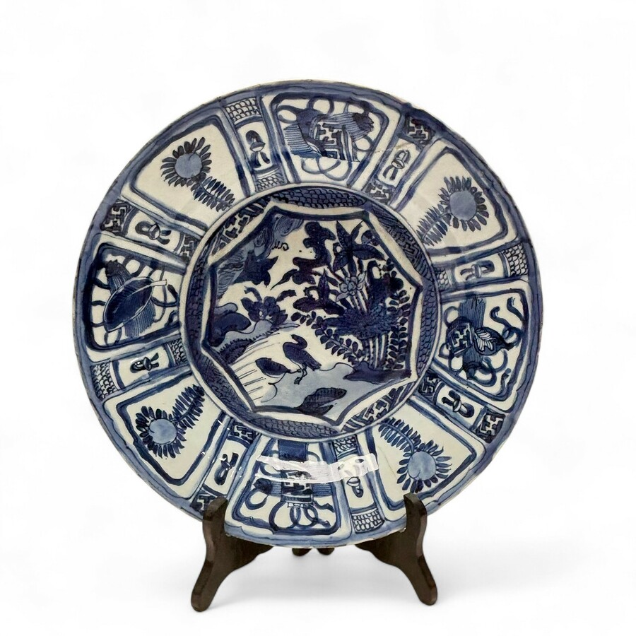 Een antieke Chinees porseleinen kraakporseleinen schotel, Wanli periode (1572-1620). Centraal decor van vogels bij een vijver, de rand met medaillons, met kostbaarheden en bloemen.