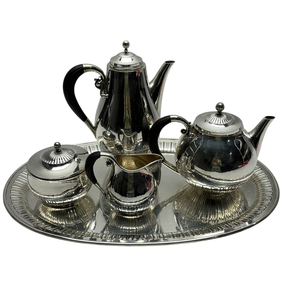 Een 20e -eeuws vijfdelig eerste gehalte (925/1000) zilveren koffie- en theeservies, bestaande uit een ovaal dienblad, koffiepot, theepot, suikerpot en melkkan. Ontwerp Johan Rohde (1956-1935) vo...