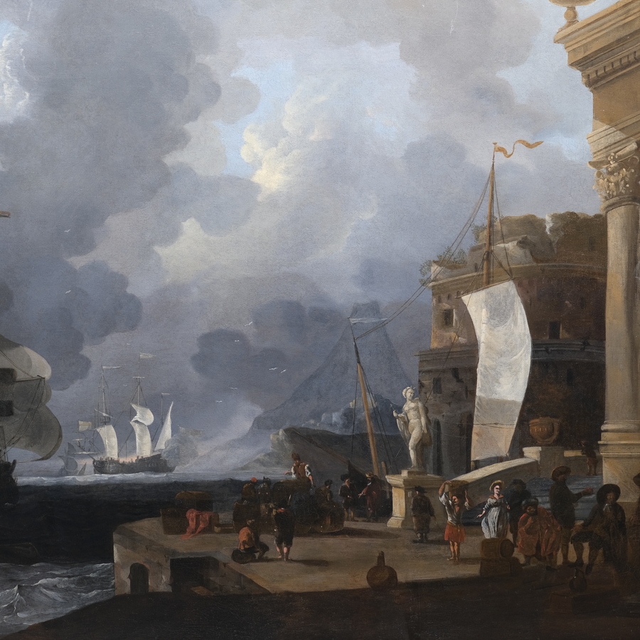 Schilderij, olieverf op doek. ‘Italianiserend zeegezicht met haven’ (‘A mediterranean harbour scene’). Draagt monogram 'LB', toegeschreven aan Wigerus Vitringa (Leeuwarden 1657 – Wirdum 1725). I...