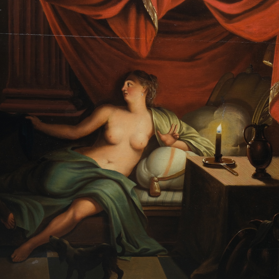 Schilderij, olieverf op paneel. "Josef door de vrouw van Potifar belaagd (Genesis 39:7)". Toegeschreven aan Gerardus Wigmana (Workum 1673 – Amsterdam 1741). Herkomst: Bonhams London, 21 april 20...