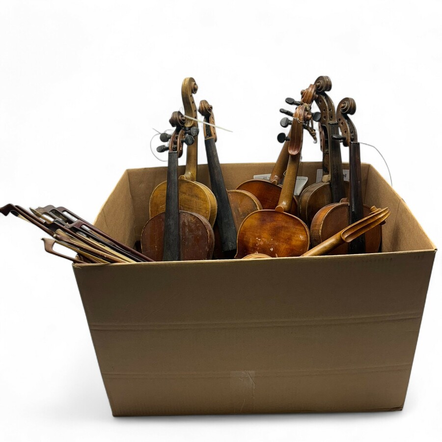 Een lot van negen oude en antieke violen en twaalf strijkstokken.