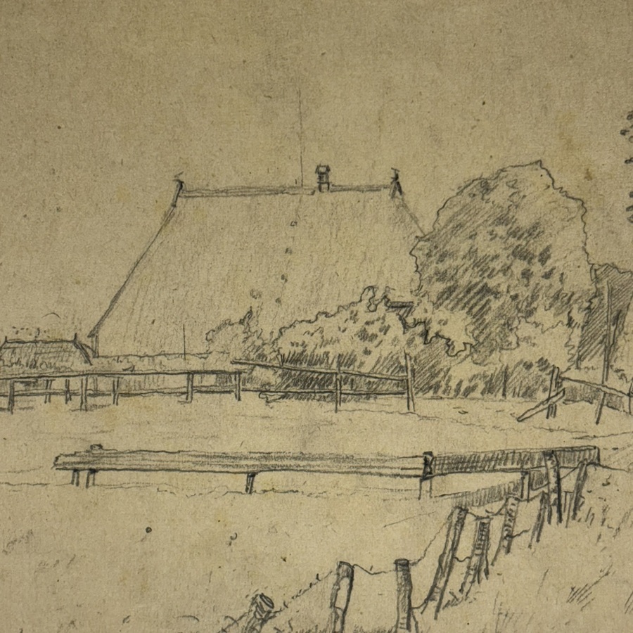 Jan Planting (1893-1955). Een potlood tekening. Boerderij te Oudega.