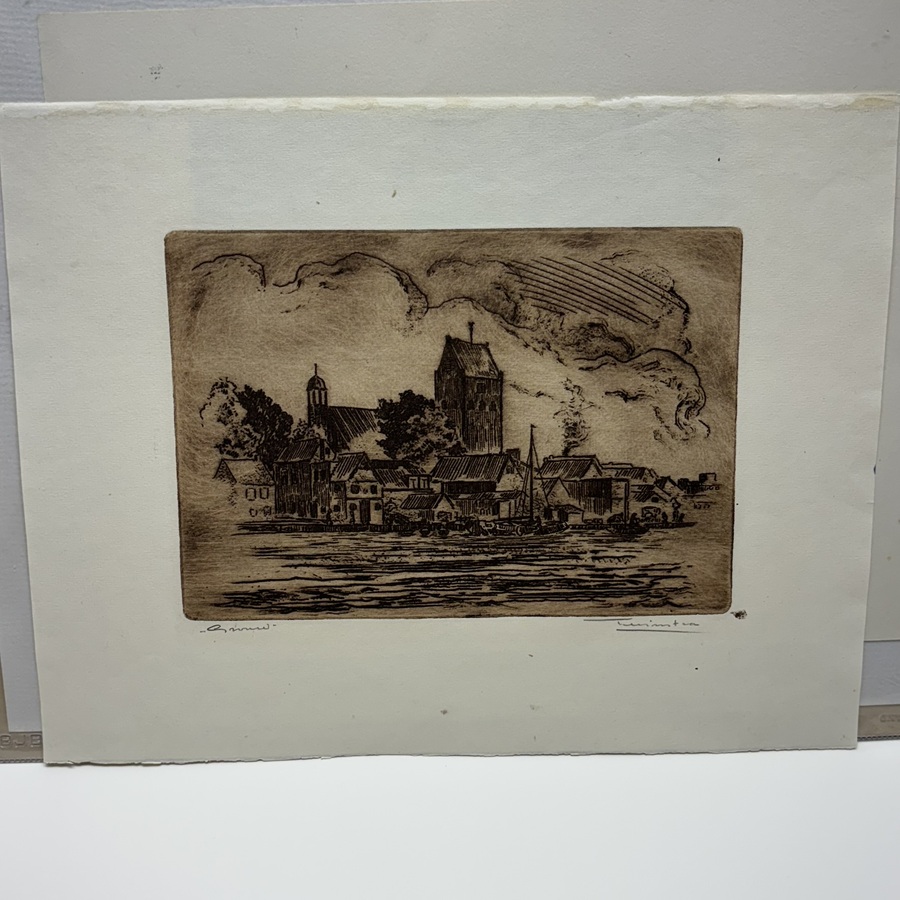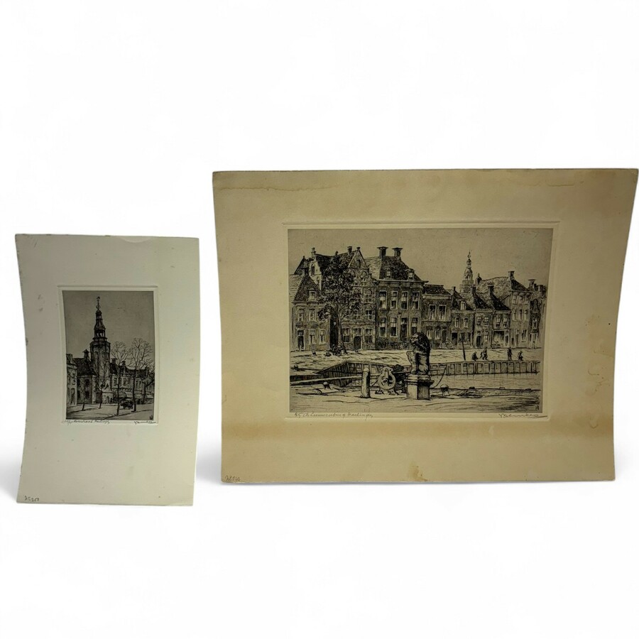 Johan Hemkes (1894-1984). Drie etsen. Voorstraat en de leeuwenbrug te Harlingen en molen ter Haar.