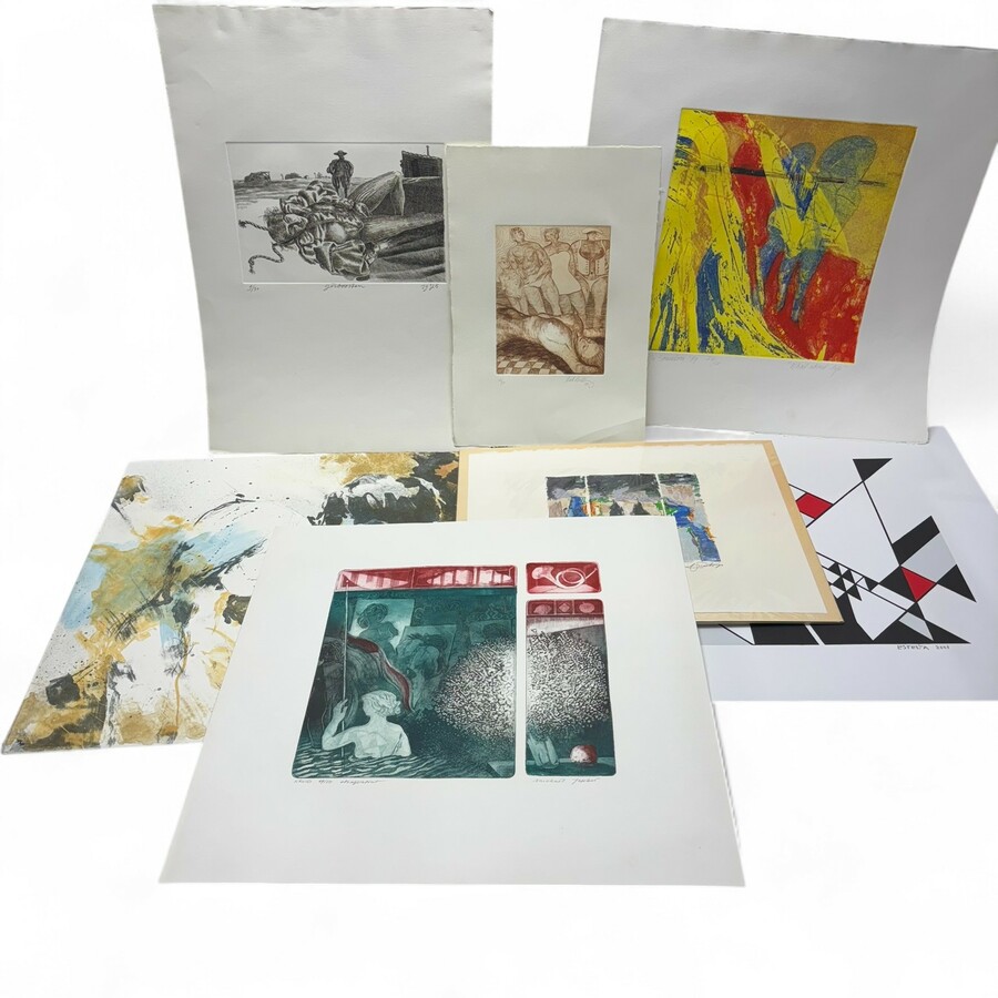 Lot met diverse kunstwerken van diverse kunstenaars. Niet gelijst.