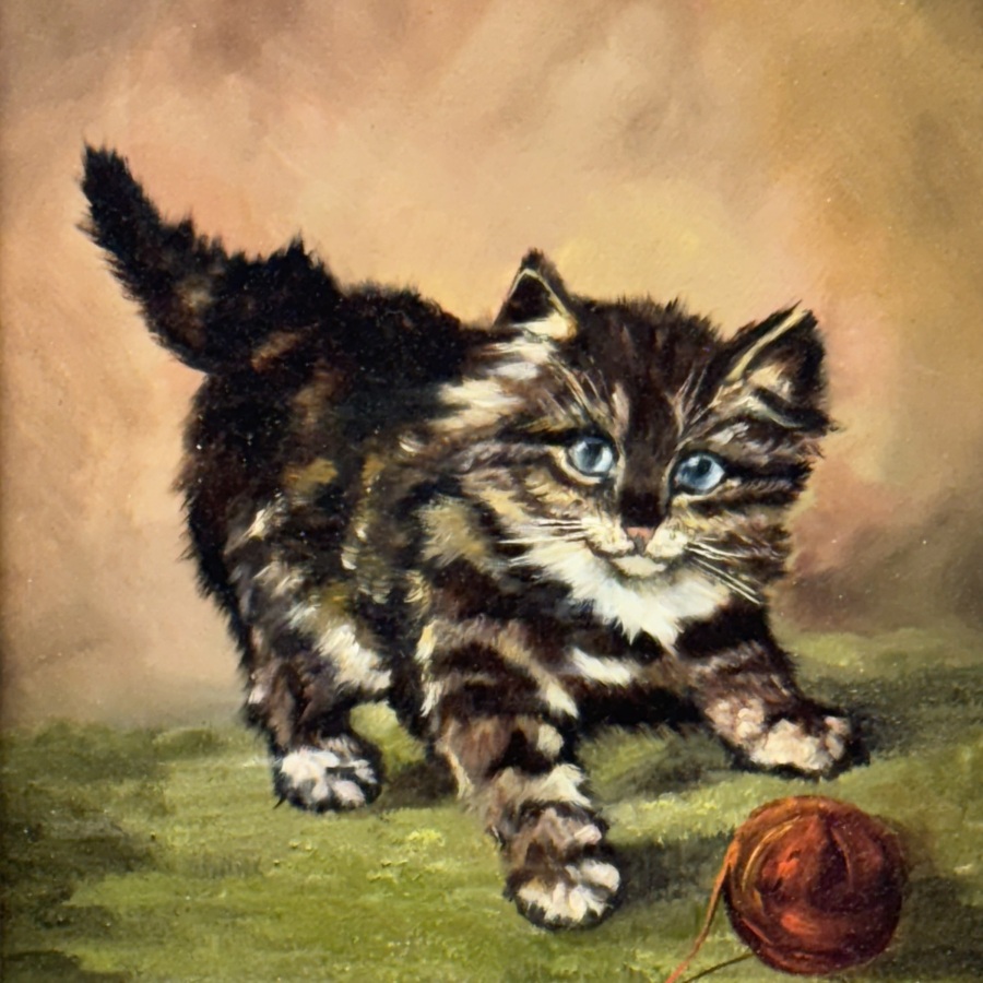 Hollandse School, schilderij: poesje spelend met bolletje wol