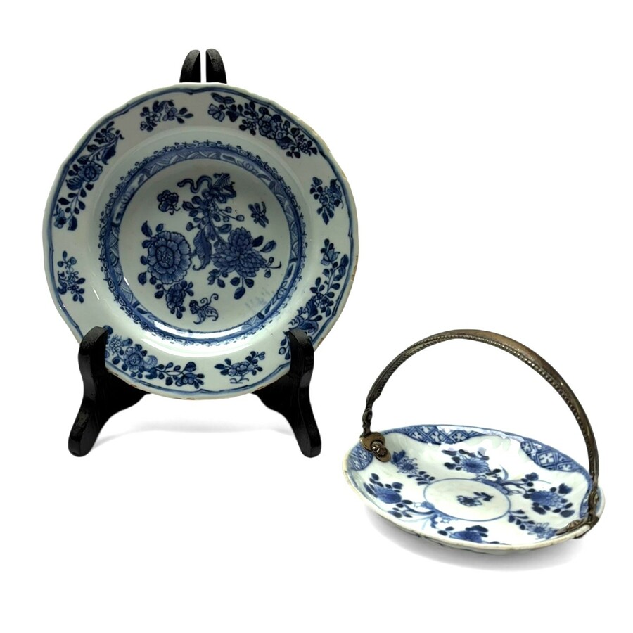 Chinees porseleinen papbordje en schotel met zilveren hengsel