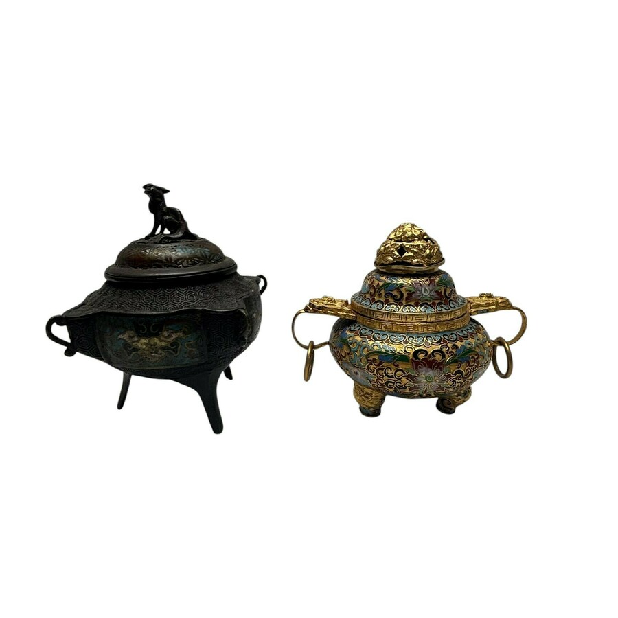 Twee Chinese bronzen met cloisoné wierookvaten zgn Koro's.