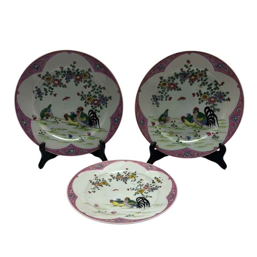 Drie porseleinen Famille Rose schotels met hanen decor. Naar Chinees voorbeeld.