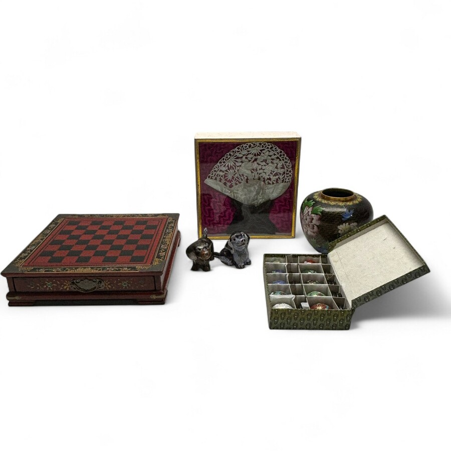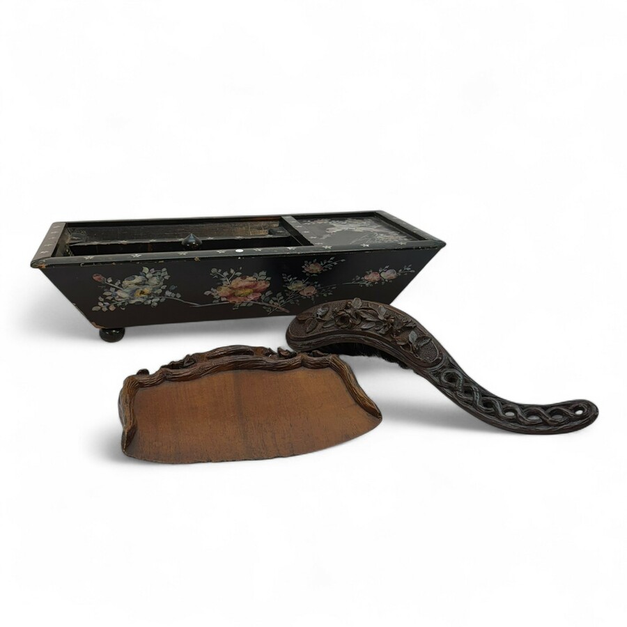 Aziatische kist, en gestoken houten stoffer en blik