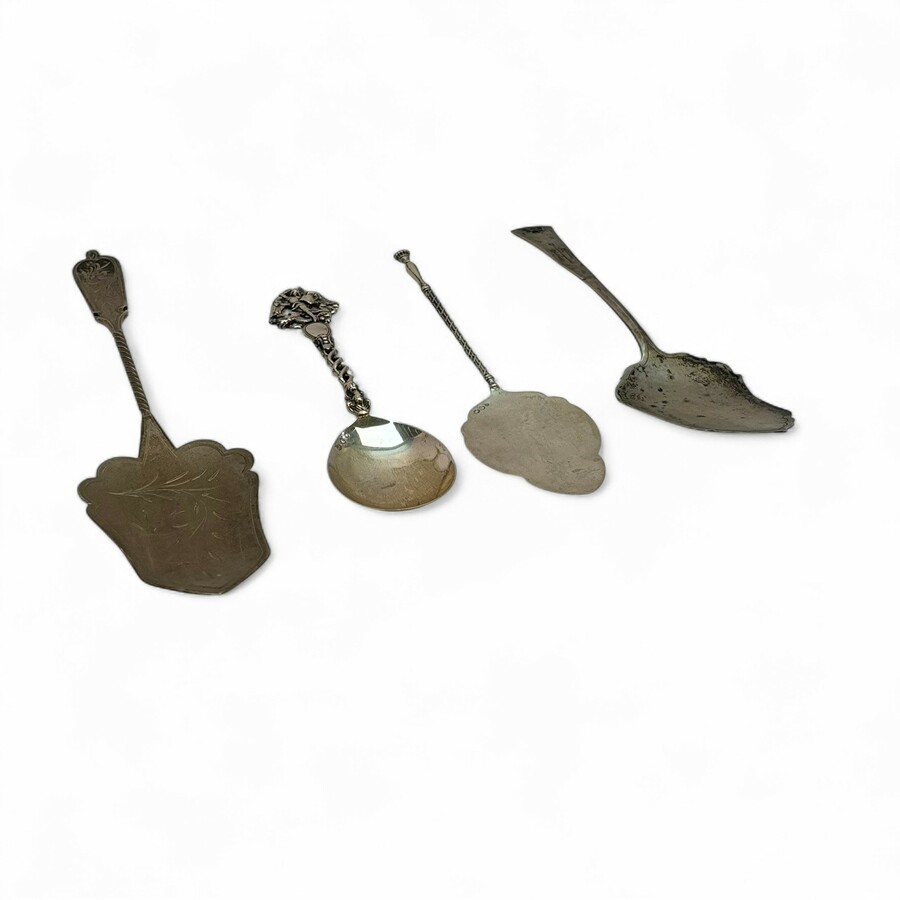 Drie zilveren taartscheppen en een gelegenheidslepel
