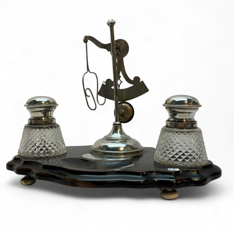 zilveren inktstel met zwart basement, 2 kristallen inktpotjes en zilveren brievenweger
