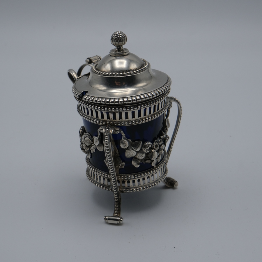 Zilveren mosterdpot met blauw glazen binnenbak