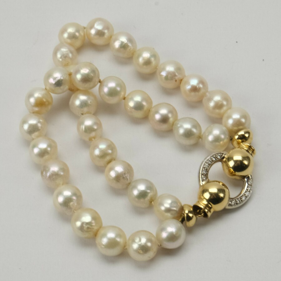 Parelarmband aan gouden slot bezet met diamant