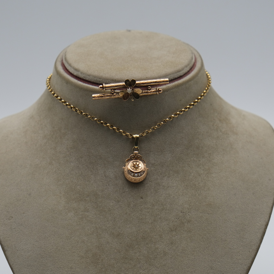 Gouden collier en broche met zaadparel