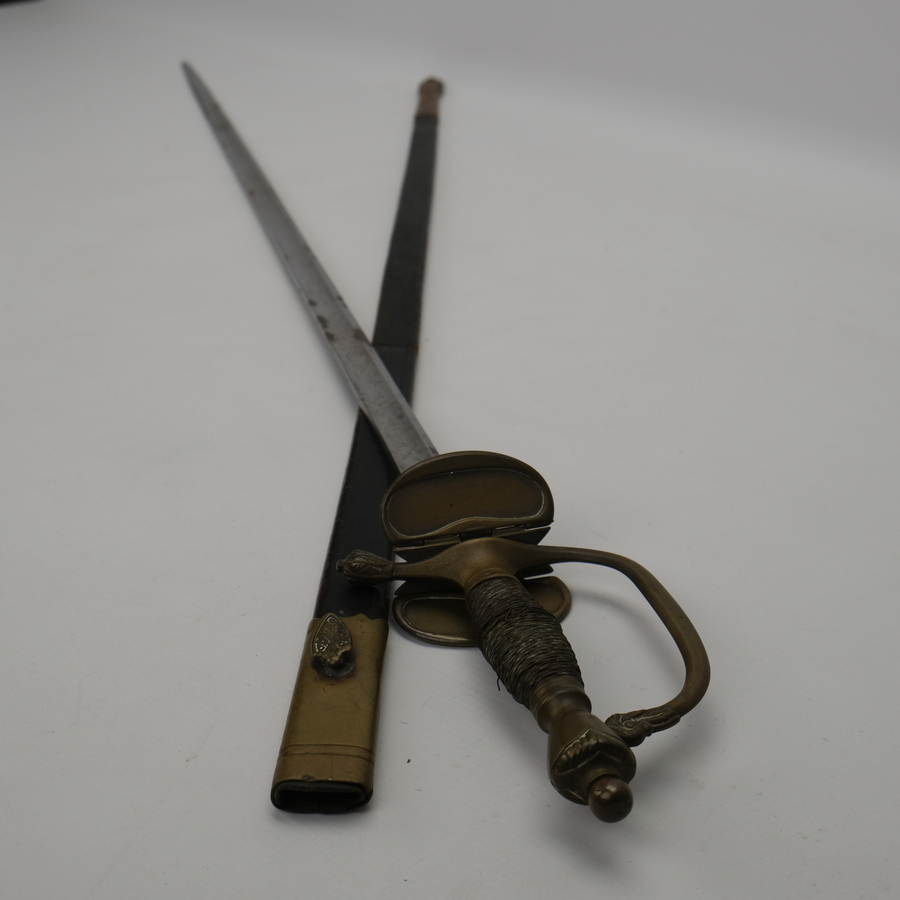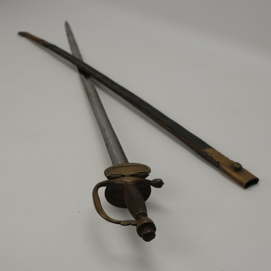 Een vroeg 19e eeuws Nederlandse degen, model M1820, met gegraveerd blad, in lederen schede.