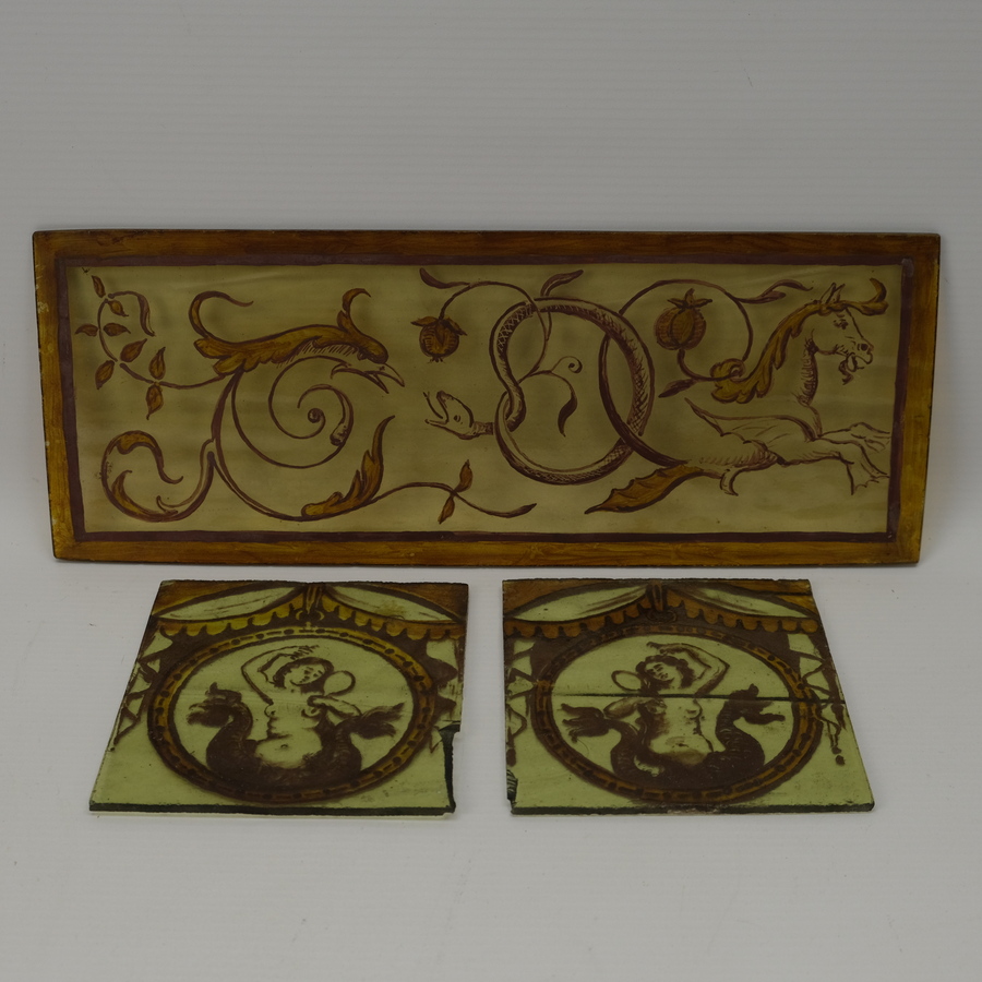 Drie 18e eeuwse gebrandschilderde glasfragmenten. Twee met meerminnen met spiegel en kam en één met zeepaard, zeeslang en fenikskop.