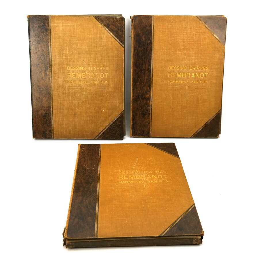 Lot van drie mappen, 'Dessins d'apres Rembrandt Harmensz van Rijn', gevuld met fascimilés van Rembrandttekeningen uit verschillende musea.