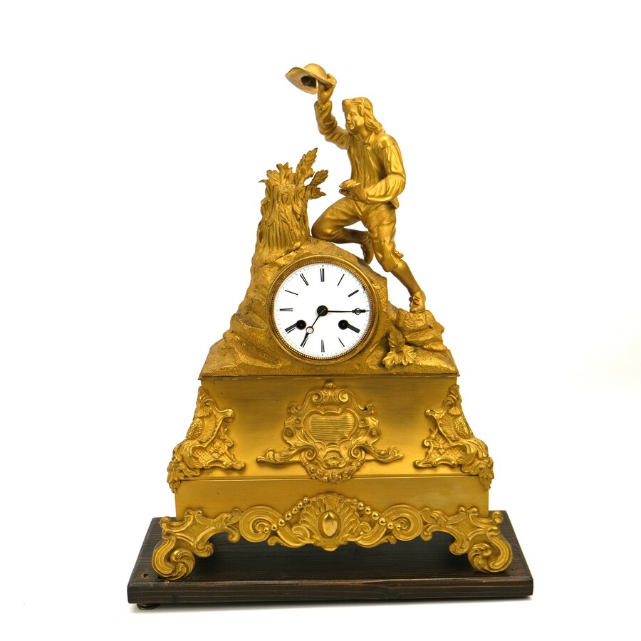 Antieke 19e eeuwse Franse vuurvergulde pendule, voorstelling van jongeman met hoed