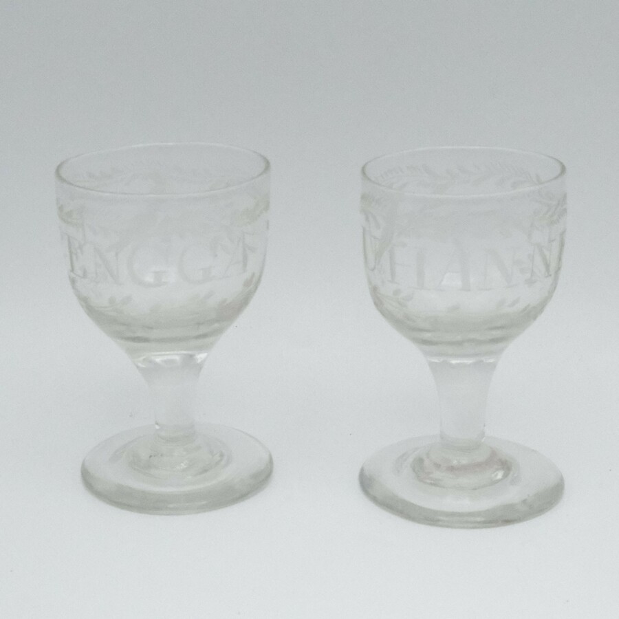 Een stel antieke vroeg 19e eeuwse wijnglazen met radgravering, floraal decor en de namen "E.F. Engga" en R.U. Hannema". Epke Foekes Engga (Spannum 1798 - Arum 1837) en Romkjen Ulbes Hannema (Wom...