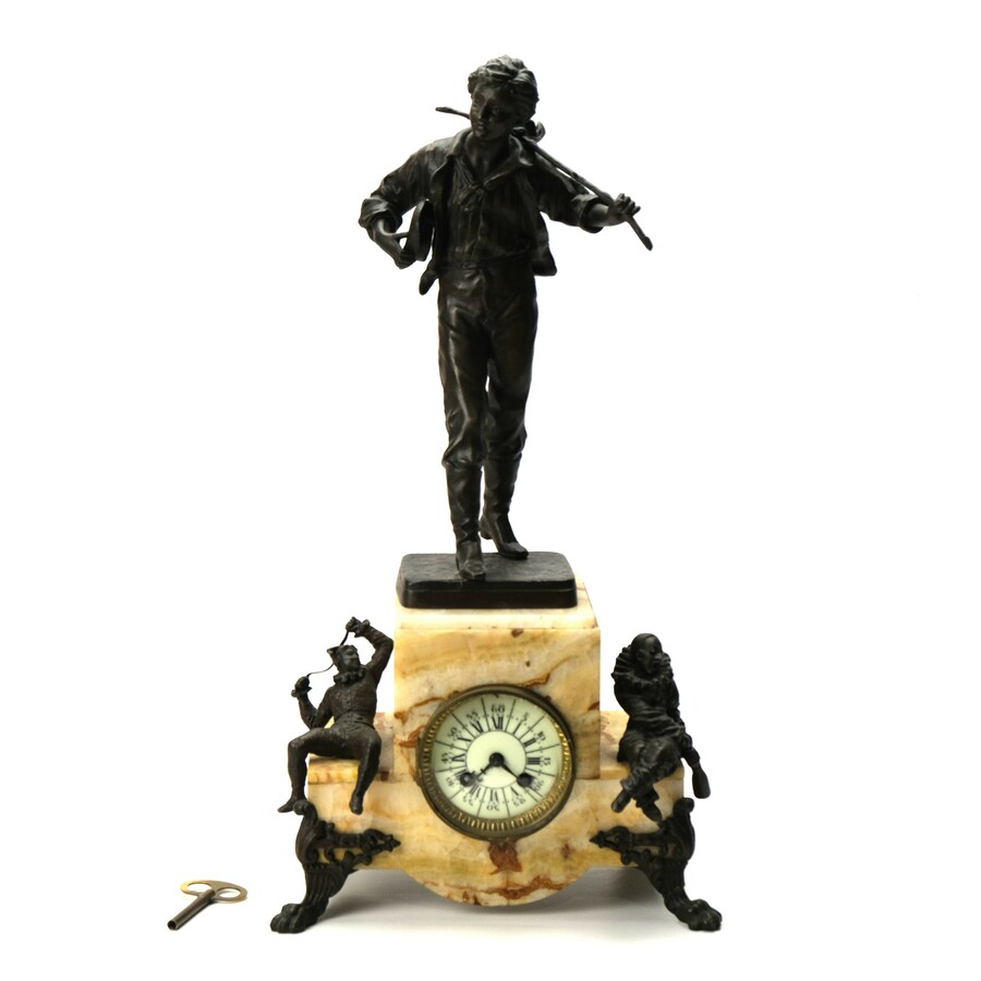 Een 19e eeuwse Franse tafelpendule met metalen sculptuur van een jongeman en twee pierrots.
