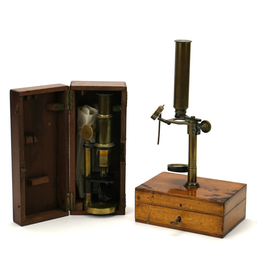 Lot van twee microscopen, 19e en begin 20e eeuw. Eén exemplaar gemonteerd op een houten kistje.
